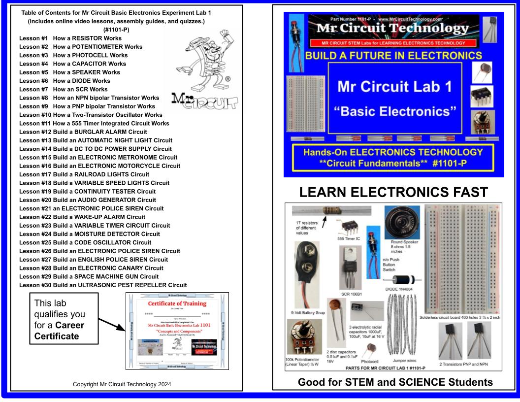 The Mr Circuit Basic Electronics Experiment Lab is a great way to begin an electronics technology education. It teaches the basics of electron theory and also gives hands-on experience of building electronic circuits.