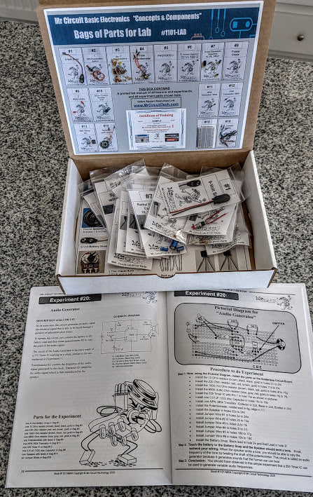 Understanding basic electronics is essential in our world where everything in controlled by electricity and electronics. Here is a way to learn it. Congratulations! This is the world's most popular basic electronics hands-on lab. 1000's sold *** And, because Mr Circuit Labs are reusable, you can offer real electronics technology training to your students for a very few dollars per student.  Also remember that there are online lessons and quizzes that go along with this lab at https://mrcircuittech.com/mrcirciuitmenu1/